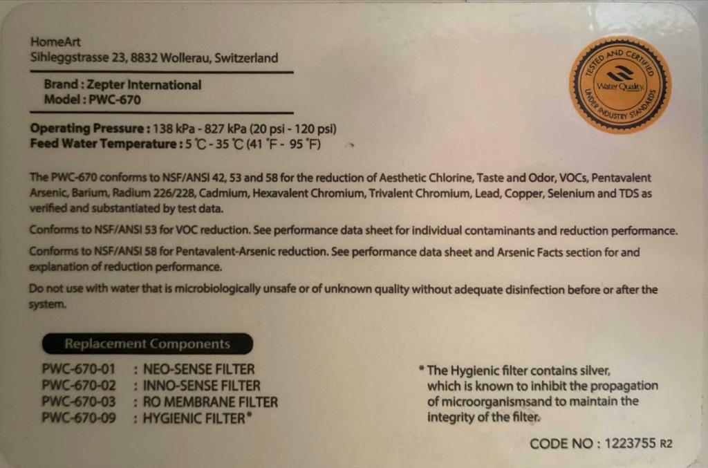 Sertifikovan i testiran od strane Asocijacije za kvalitet vode prema međunarodnom standardu NSF/ANSI 42,53 58. Inovacija je u 5-stepenim filterom kojim se obezbeđuje potpuno čista voda